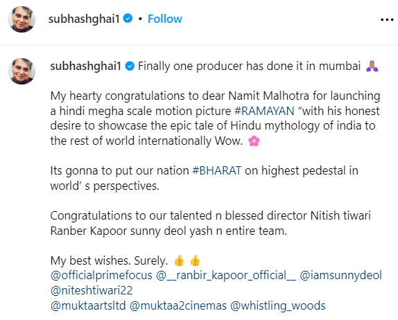 बीते दिन निर्देशक सुभाष घई ने रामायण की कास्ट को बधाई देते हुए एक लंबा चौड़ा पोस्ट शेयर किया था। अपने इस पोस्ट में उन्होंने निर्देशक नितेश तिवारी के अलावा रणबीर कपूर के अलावा सनी देओल और केजीएफ स्टार यश का भी नाम लिखा। इस बात से ये तो कन्फर्म हो गया कि सनी देओल और कन्नड़ के रॉकिंग स्टार यश भी ‘रामायण’ का हिस्सा है।