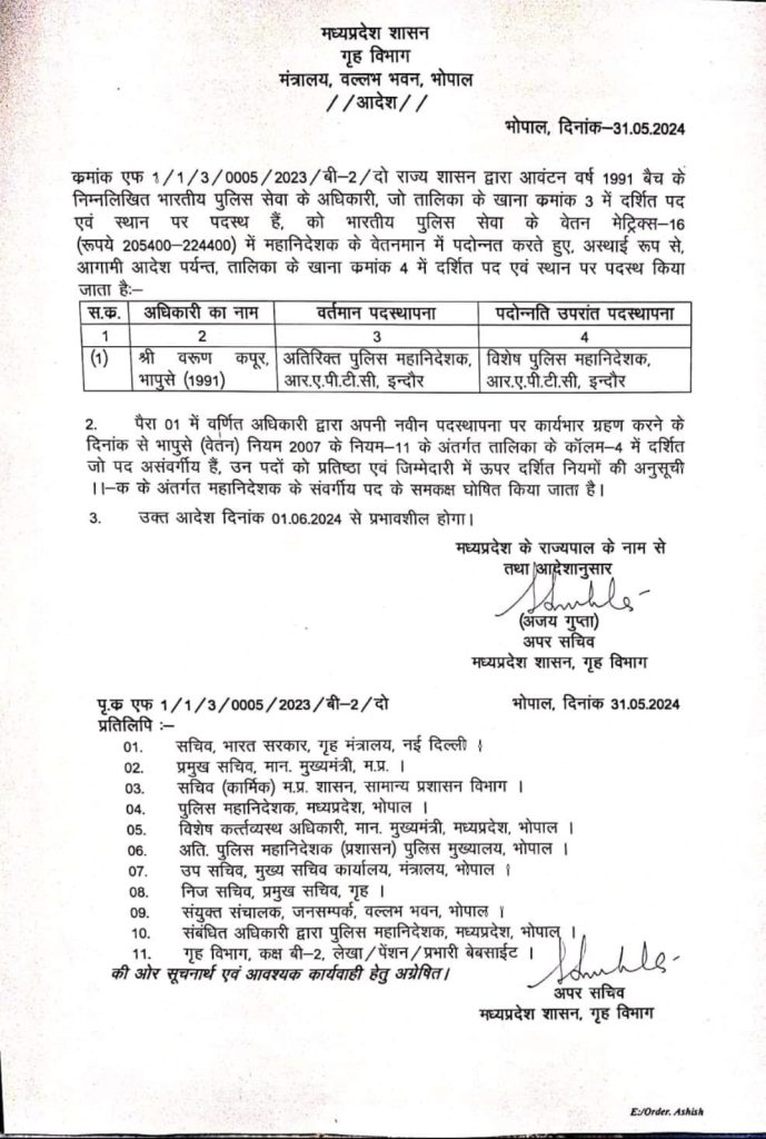 MP IPS PROMOTION: गृह विभाग ने जारी किया आदेश, वरुण कपूर बने स्पेशल DG