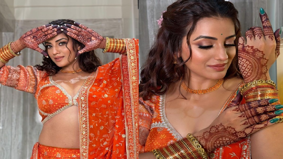 सोशल मीडिया क्वीन अक्षरा सिंह ने अपना इंस्टा अपडेट किया है और लहंगे में बहुत प्यारी-प्यारी फोटोज डाली हैं। फोटोज में आप देख सकते हैं कि अक्षरा ने हाथों में मेहंदी लगा रखी हैं और हरे रंग की नेल पेंट भी लगा रखी हैं। एक्ट्रेस ने ऑरेंज कलर का जोधपुरी प्रिंट का लहंगा पहना है और ऑरेंज कलर का चूड़ा भी पहना है। अपने लुक को पूरा करने के लिए अक्षरा ने बालों को कर्ल कर रखा है और हैवी मेकअप ले रखा है। हरियाली तीज के मौके पर एक्ट्रेस का ये ऑरेंज लुक काफी सुंदर लग रहा है। फैंस भी एक्ट्रेस के इस लुक तो देखकर अपने नजरे नहीं हटा पा रहे हैं।