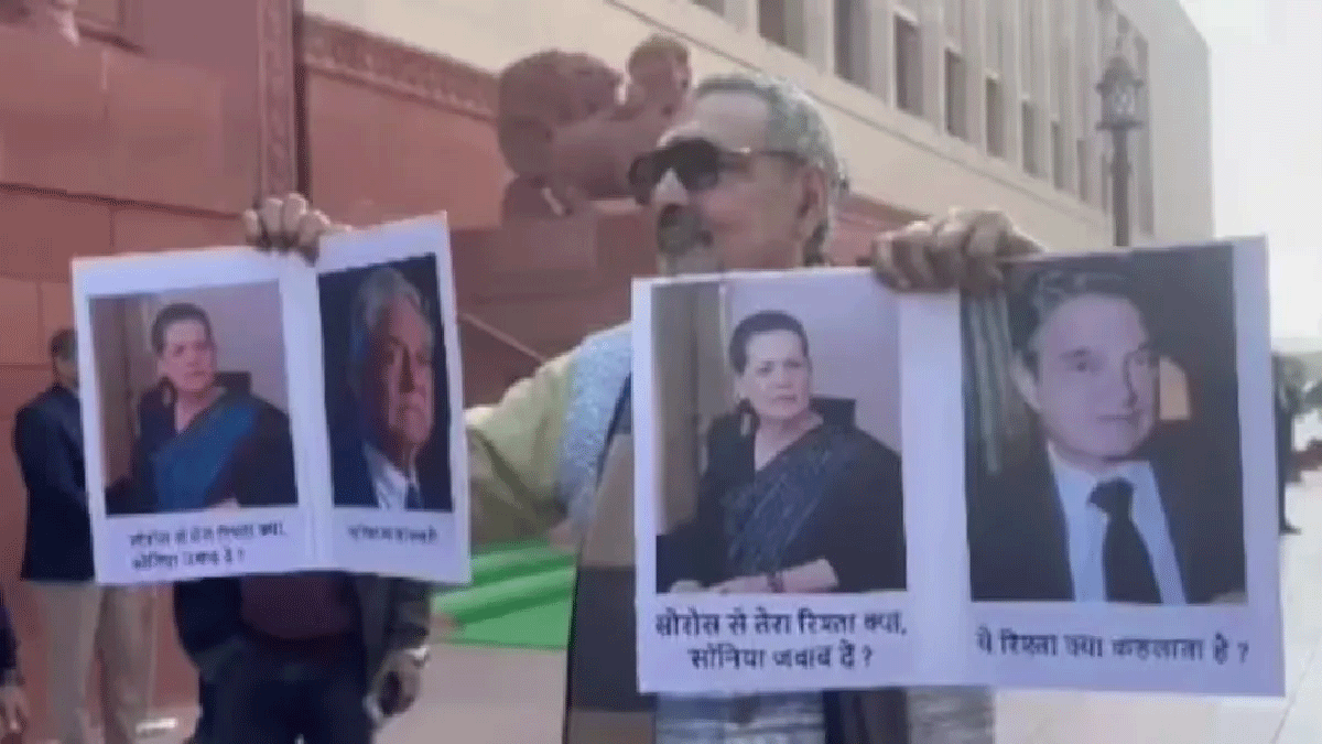 नई दिल्ली। लोकसभा और राज्यसभा में पिछले कई दिनों से लगातार हंगामा जारी है। कांग्रेस जहां अडाणी मुद्दे पर सरकार को घेरने की कोशिश कर रही है तो वहीं बीजेपी सोनिया गांधी और भारत विरोधी गतिविधि में शामिल जॉर्ज सोरोस के बीच सीधा लिंक होने के आरोप लगा रही है। बीजेपी का कहना है कि अमेरिकी अरबपति जॉर्ज सोरोस के नेहरू-गांधी परिवार के साथ गहरे संबंध हैं। केंद्रीय मंत्री गिरिराज सिंह आज संसद परिसर में सोनिया गांधी और जॉर्ज सोरोस के पोस्टर लेकर पहुंचे। उन्होंने पत्रकारों के सामने पोस्टर लहरा कर विरोध जताया।
