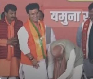 नई दिल्ली। दिल्ली विधानसभा चुनाव के मद्देनजर प्रधानमंत्री नरेंद्र मोदी ने करावल नगर सीट पर एक विशाल जनसभा को संबोधित किया। इस दौरान एक अप्रत्याशित घटना देखने को मिली जब पटपड़गंज से बीजेपी प्रत्याशी रविंद्र सिंह नेगी मंच पर पहुंचे और प्रधानमंत्री के पैर छूने की कोशिश की। इसके जवाब में पीएम मोदी ने भी तीन बार उनके पैर छुए और फिर उन्हें वहां से जाने का इशारा कर दिया।